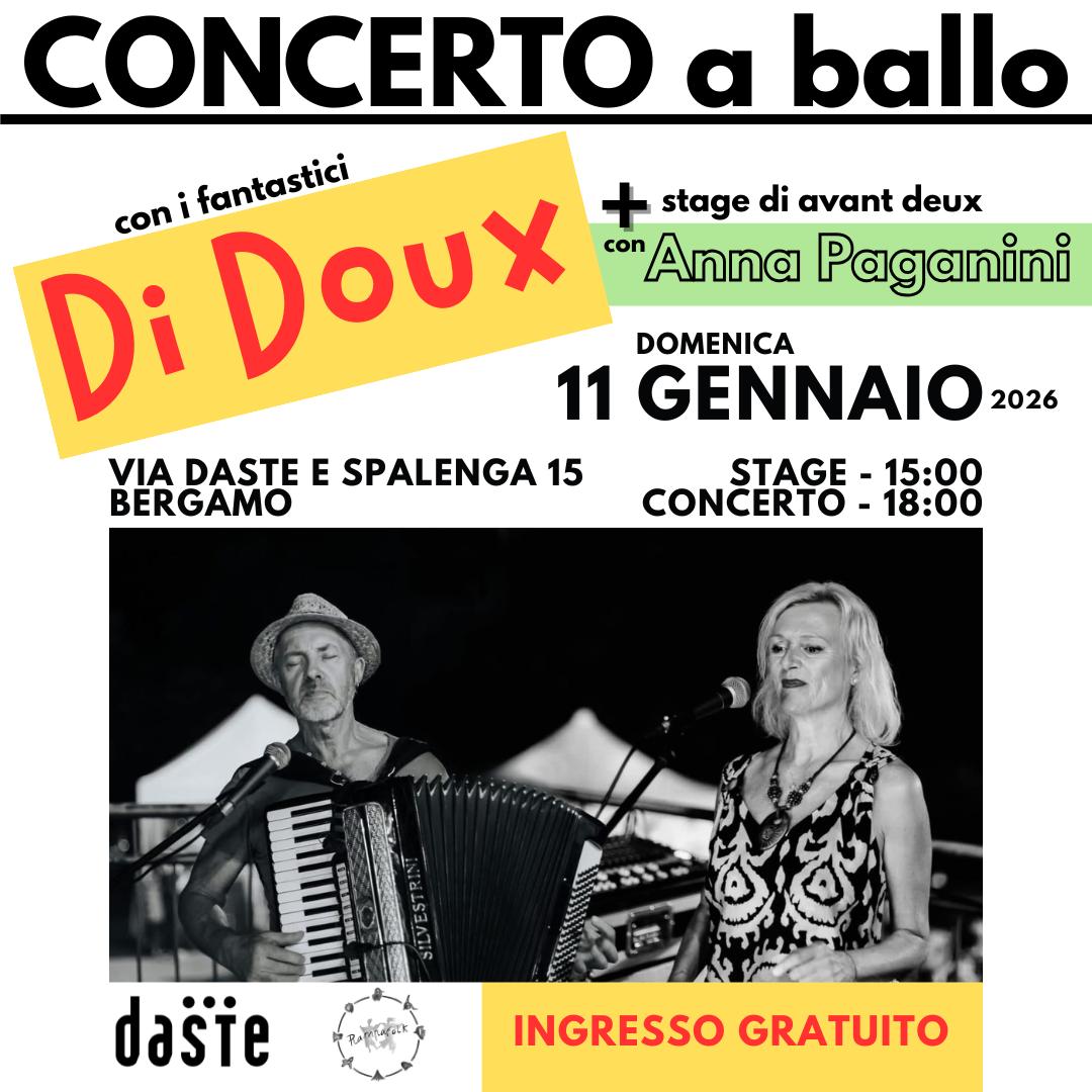 Di Doux: sono Sara Pierleoni, voce e percussioni , e Giuseppe Grassi , fisarmonica e pianoforte,  un progetto nato dalla passione per la danza e la musica tradizionale, francese e italiana…Bal Folk, ma non solo!